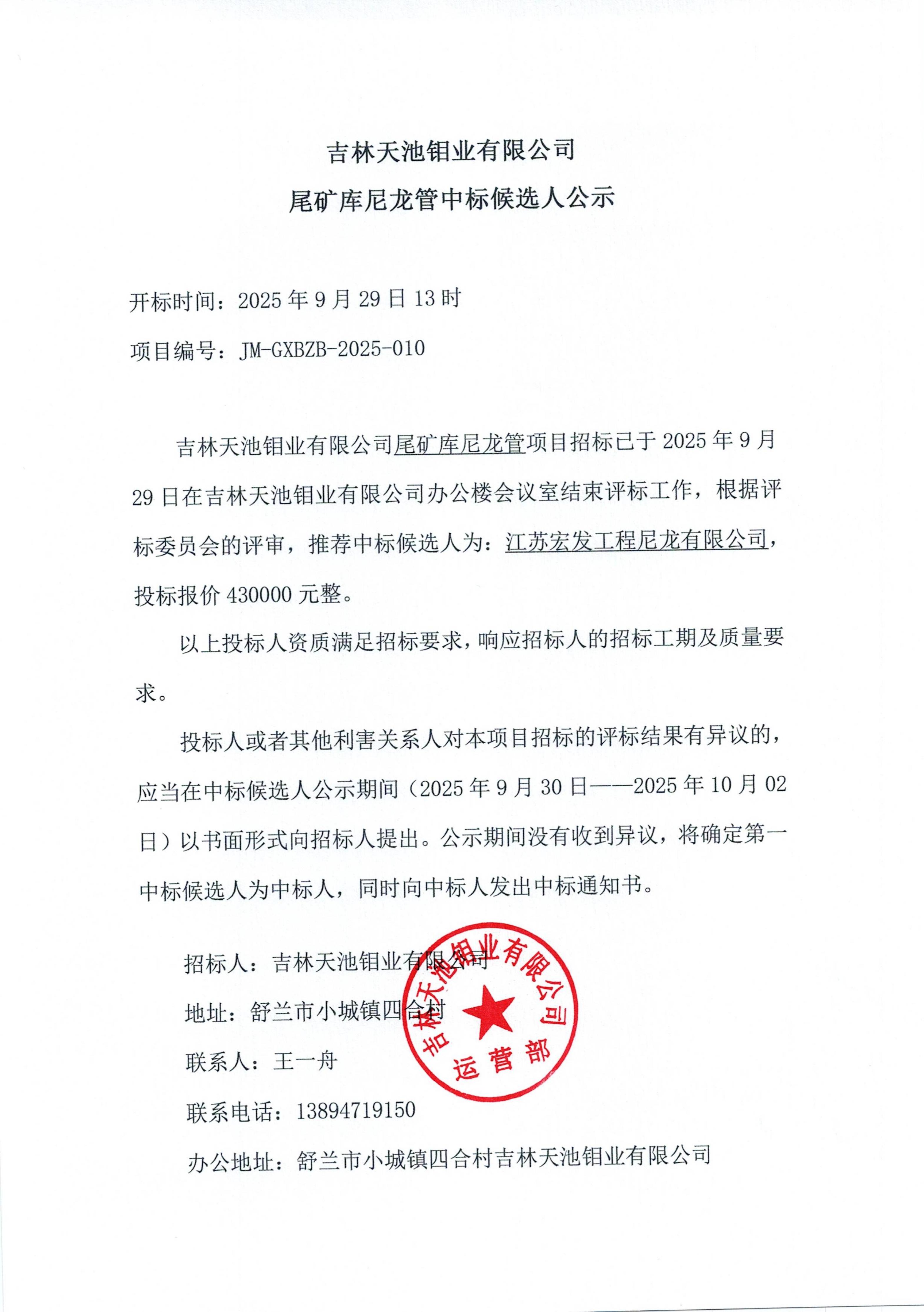 吉林天池鉬業(yè)有限公司尾礦庫(kù)尼龍管中標(biāo)候選人公示